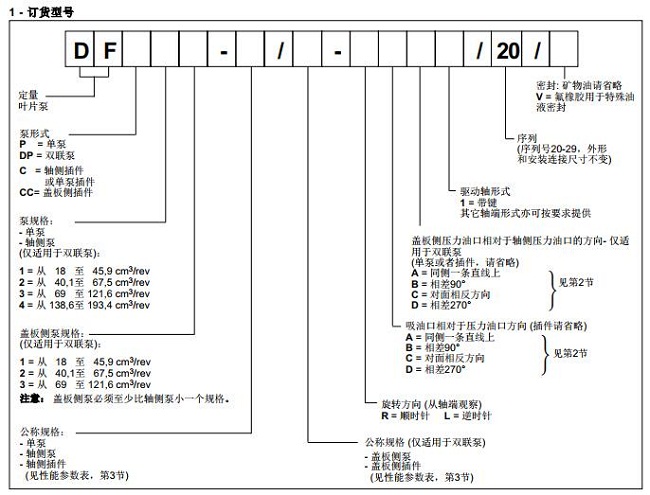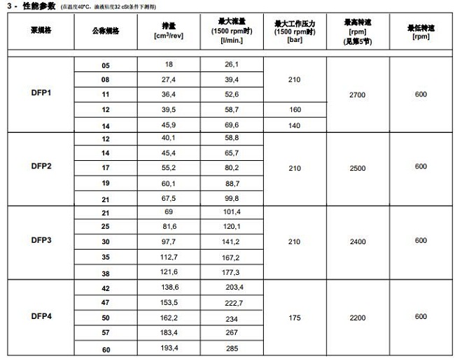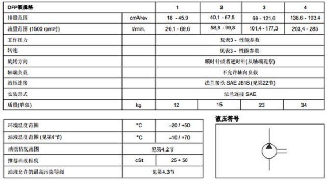 DFP泵是固定排量葉片泵,由四種不同的尺寸制成,分為五種標稱排量。它們可以使用單個泵送元件(單泵)或雙泵元件(雙泵)。