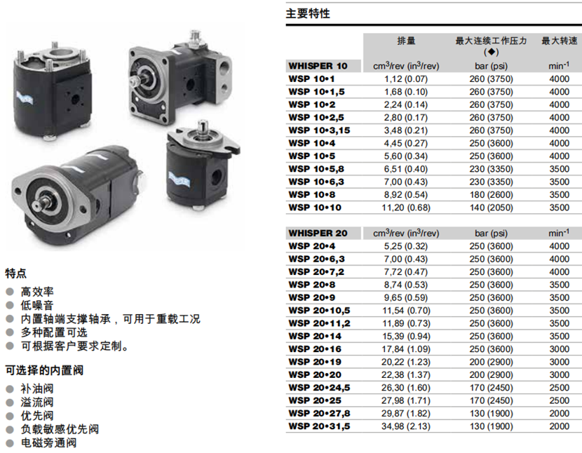 威世(WHISPER)系列擁有國際專利技術,專門的低噪音新型齒輪泵,軸、法蘭和接口尺寸及形式有多種標準可選(包括SAE,DIN,EUROPEAN等),應用廣泛。