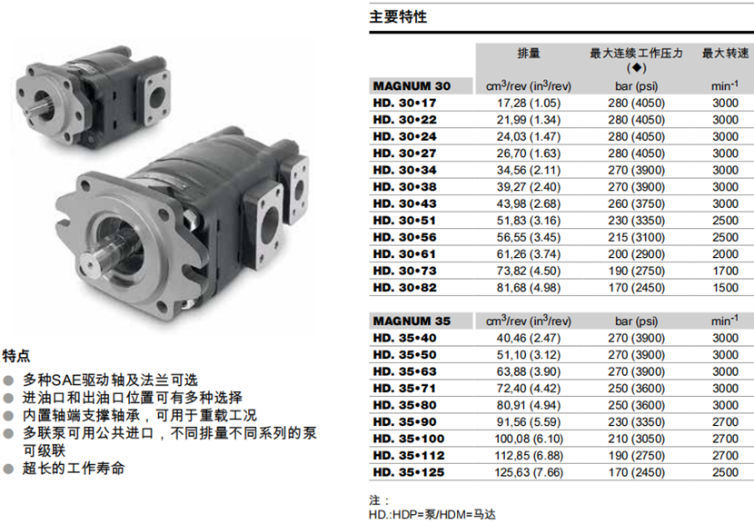 排量范圍:從17,28 cm3/rev (1.05 in3/rev) 到125,63 cm3/rev (7.66 in3/rev);分30, 35兩個規(guī)格。