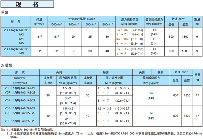 不二越VDR22設計系列變量葉片泵技術參數: