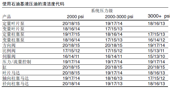3、使用抗磨液壓油或汽車曲軸箱油時推薦的清潔度等級基于系統中的最高油液壓力等級并編號于下表中。其他允許的油液、重載工作循環或極端溫度是調整這些代號的理由。準確的細節見威格士出版物561。